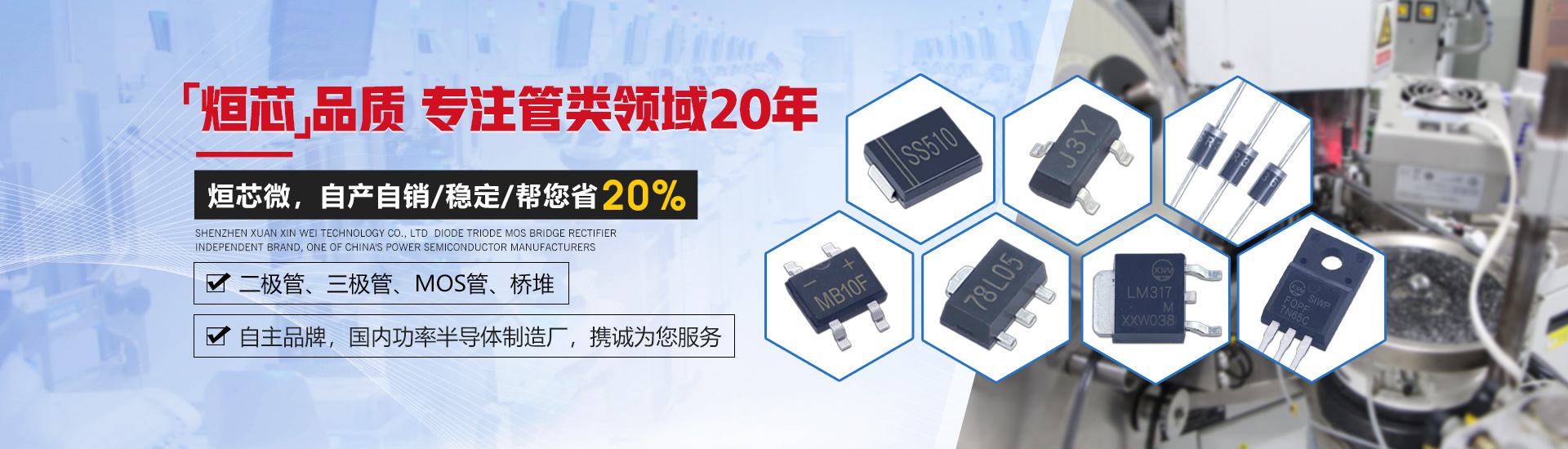 深圳市烜芯微科技有限公司是一家集研發(fā)、生產(chǎn)、銷(xiāo)售于一體,專(zhuān)注于二極管、三極管,MOS管、橋堆等功率半導(dǎo)體領(lǐng)域發(fā)展的企業(yè)。采用國(guó)際領(lǐng)先的GPP芯片生產(chǎn)工藝及一心多Die高精密制造工藝,擁有功率半導(dǎo)體器件工程實(shí)驗(yàn)室,全自動(dòng)高精密生產(chǎn)設(shè)備,產(chǎn)品層層把控,全程可追溯,保障了每只產(chǎn)品的卓越品質(zhì)。 產(chǎn)品封裝包括SMA,SMAF,SMB,SMBF,SMC,SOD-123,SOD-123FL,SOD-323,SOD-323FL,SOD-523,SOD-723,SOT-23,SOT-89,SOT23-3L,SOT23-5L,SOT23-6L,SOT-223,SOT-523,SOT-723,DO-41,DO-15,DO-27,DO-35,R-1,R-6,LL-34,LL-41,TO-277,TO-92,TO-92S,TO-92L,TO-126,TO-251,TO-252,TO-262,TO-263,TO-220,TO-220F,TO-247,TO-3P,TO-264,MBS,MBF,MBM,ABS,UMB,UMSB,DB,DBS,D3K,KBP,GBP,GBU,GBL,GBJ,KBL,KBU,KBJ,KBPC,KBPC6,KBPC8,KBPC-W,DNF,TSSOP-8,TSSOP-16,SOP-4,SOP-6,SOP-8,SOP-10,SOP-14,SOP-16,DIP-4,DIP-6,DIP-8,DIP-10,DIP-14,DIP-16,月產(chǎn)各封裝達(dá)6億只。 公司通過(guò)了ISO14001環(huán)境管理體系認(rèn)證,產(chǎn)品均獲得了ISO9001質(zhì)量體系認(rèn)證、UL、SGS等認(rèn)證,符合歐盟最新RoHs指令。擁有和致力于烜芯微/XXW自主品牌產(chǎn)品的推廣,提供技術(shù)支持,選型替換,cost down方案及擁有專(zhuān)業(yè)的生產(chǎn)管理團(tuán)隊(duì)和銷(xiāo)售團(tuán)隊(duì),保證了供貨穩(wěn)定及售前選型服務(wù)等問(wèn)題。 公司產(chǎn)品廣泛應(yīng)用于開(kāi)關(guān)電源、適配器、逆變器、控制器、汽車(chē)電子、家用電器、通訊設(shè)備、無(wú)線充、鋰電池保護(hù)板、驅(qū)動(dòng)電機(jī)、安防警報(bào)、太陽(yáng)能光伏產(chǎn)業(yè)等多個(gè)領(lǐng)域。取得了國(guó)內(nèi)外眾多品牌大廠的認(rèn)可與合作,我們將堅(jiān)持奉行“烜芯品質(zhì),誠(chéng)信經(jīng)營(yíng),合作共贏”為公司經(jīng)營(yíng)理念!竭誠(chéng)為新老客戶提供優(yōu)質(zhì)的產(chǎn)品及服務(wù)。